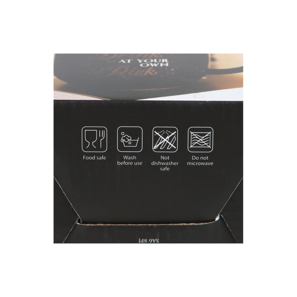 Bold and mischievously charming, this oversied teacup-shaped mug has a 'Drink at Your Own Risk' design. It's a statement piece that offers a playful warning to anyone who dares borrow your mug without permission. Handwash only. Not suitable for microwave use. 360ml.