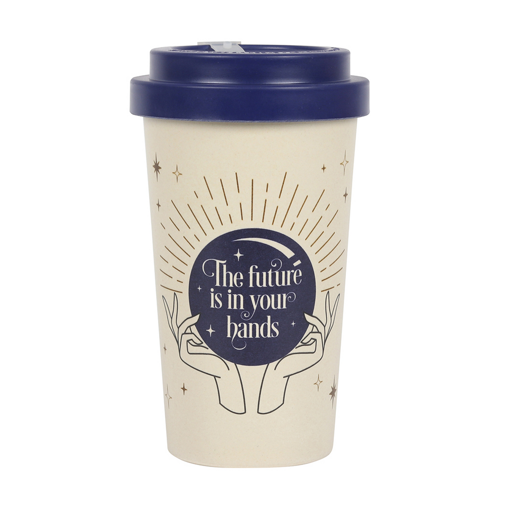 This eco-friendly, reusable travel mug is made out of durable bamboo fibre and comes with a matching silicone sleeve and lid for keeping hydrated (and caffeinated) on the go. This style features a mystical fortune teller design with 'The Future is in Your Hands' text and also includes a convenient stopper to prevent accidental spills. Dishwasher safe mug with hand wash only lid and sleeve. Do not microwave. Packaged Dimensions: H15.6cm x W9.9cm x D9cm"