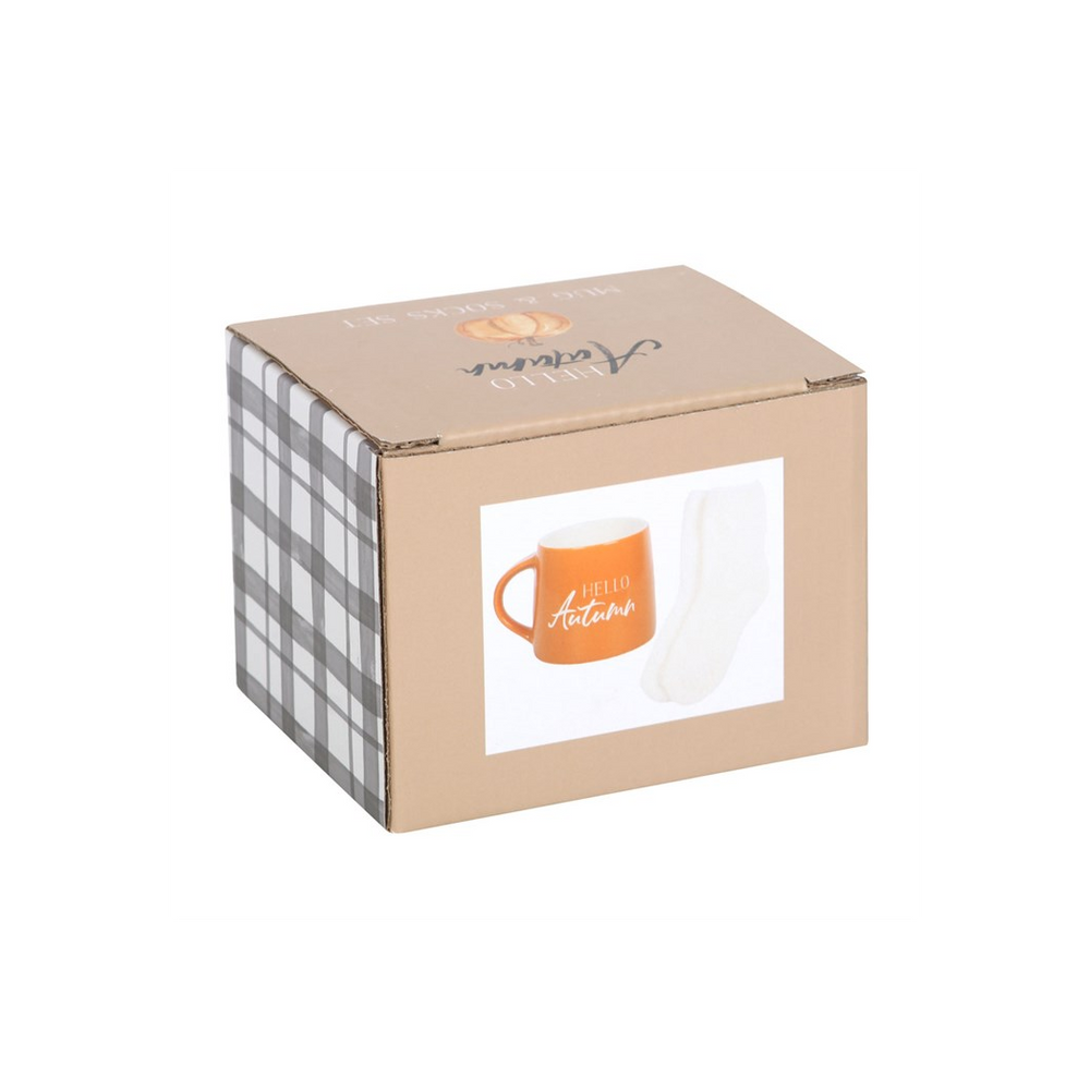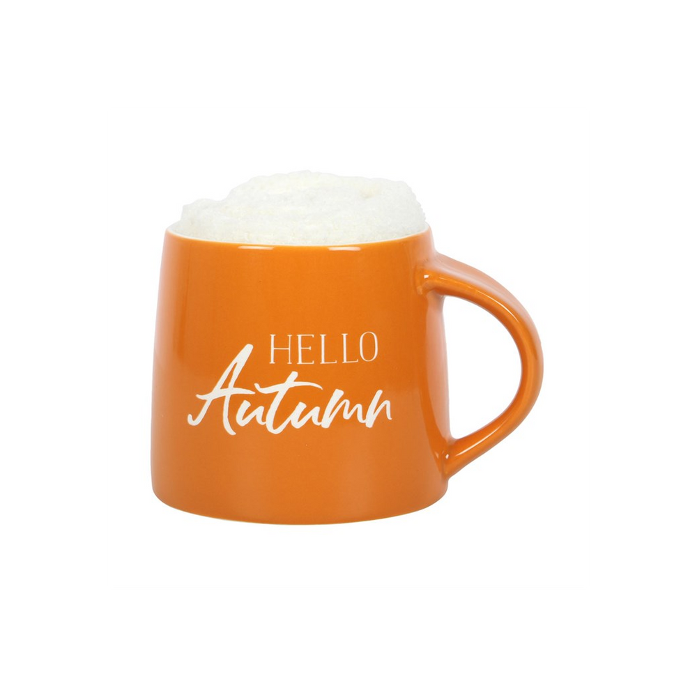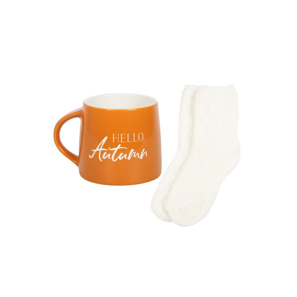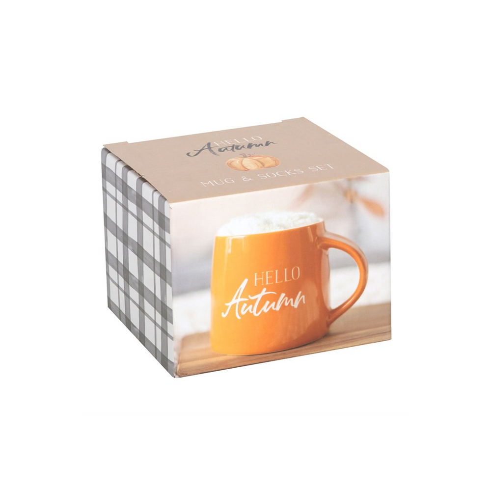 Cosy up on a chilly autumn day with this charming mug and socks set. Includes a sweet mug with 'Hello Autumn' text and a matching pair of fluffy socks, making it a great gift for warming up loved ones from the inside out. 380ml capacity. Dishwasher and microwave safe.