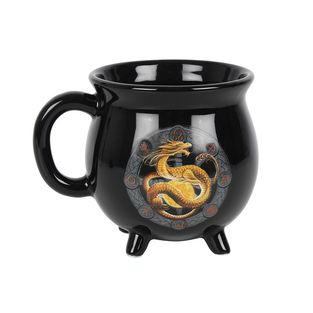 This black cauldron shaped mug features the 'Litha' design from the 'Dragons of the Sabbats' art series by fantasy artist Anne Stokes. Add your favourite hot beverage to see the symbols of the Wheel of the Year design change colour.Packaged Dimensions: H11.5cm x W12.2cm x D10.5cm
