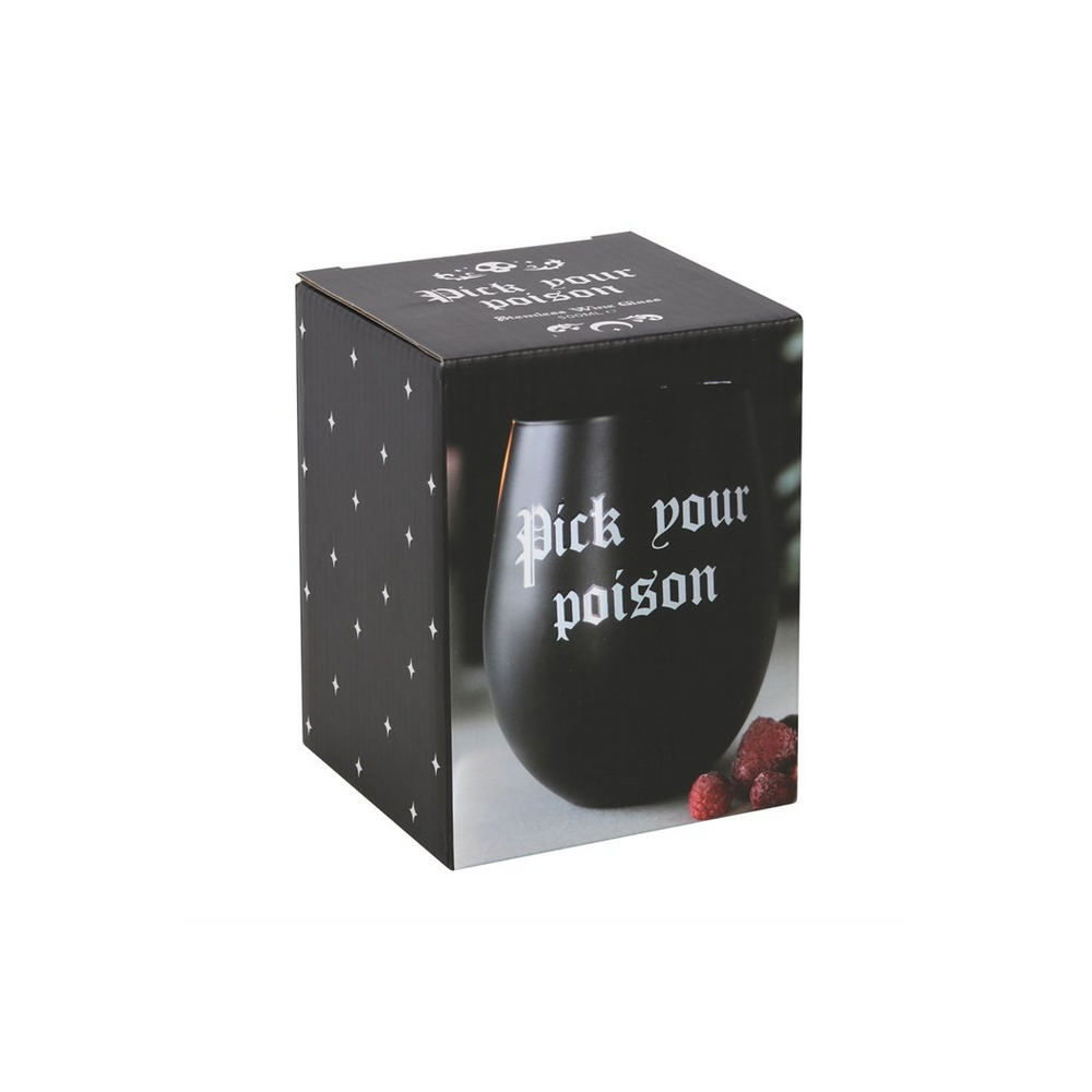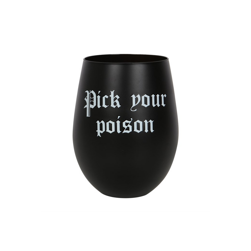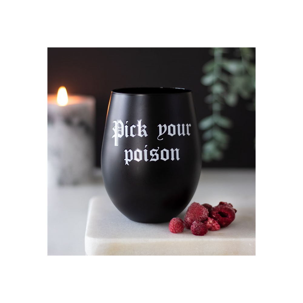 This gothic themed stemless wine glass features the text 'Pick your poision' in striking white text, standing out against the dark black glass. Ideal gift for any witch or wizard. Product Dimensions: H12cm x W9cm x D9cm Packaged Dimensions: H12.8cm x W9.5cm x D9.5cm