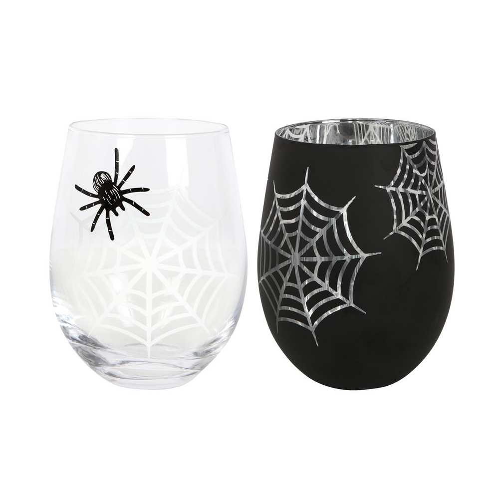 Have your wine and drink it, too! This set of 2 stemless glasses is perfect for nights of mischief. Designs feature a printed spider and his web (clear glass) and an eye-catching web silhouette with a silver interior (black). 500ml capacity each. Hand wash only. Do not microwave.