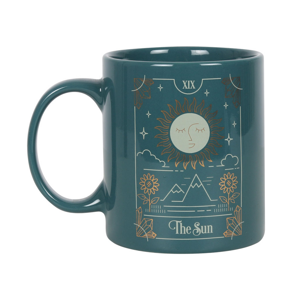 Start your day right with a cup of caffeine in this green mug featuring 'The Sun' tarot card illustration in white and metallic gold. Suitable for microwave and dishwasher use.Packaged Dimensions: H10.3cm x W11.5cm x D8.7cm