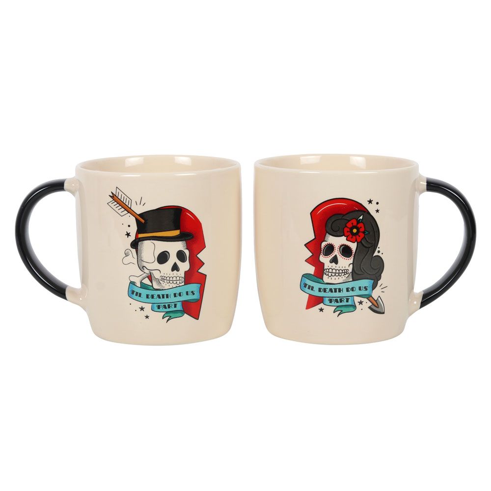 Inspired by vintage tattoos, this mug set makes a brilliant gift for weddings or anniversaries. Featuring a his and hers mug with half a heart on each along with the words 'Til Death Do Us Part'.Packaged Dimensions: H9.9cm x W23.9cm x D9.2cm"